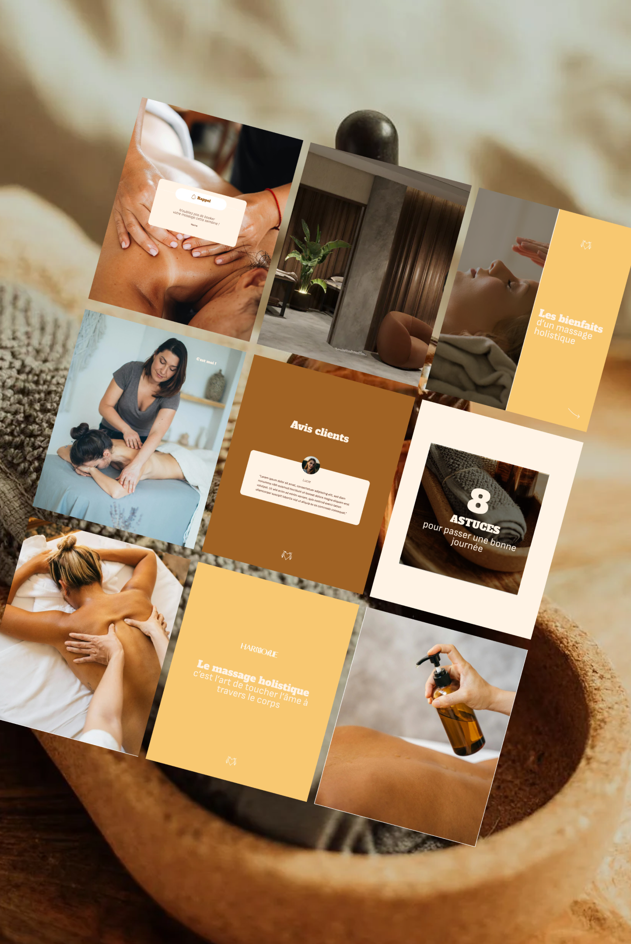 La palette de couleurs choisie, composée de tons beiges et jaunes doux, apporte chaleur et sérénité, renforçant l’idée d’un environnement apaisant et accueillant. Ce projet a permis d’associer esthétique et émotion afin de créer une identité visuelle cohérente avec l’univers du bien-être.