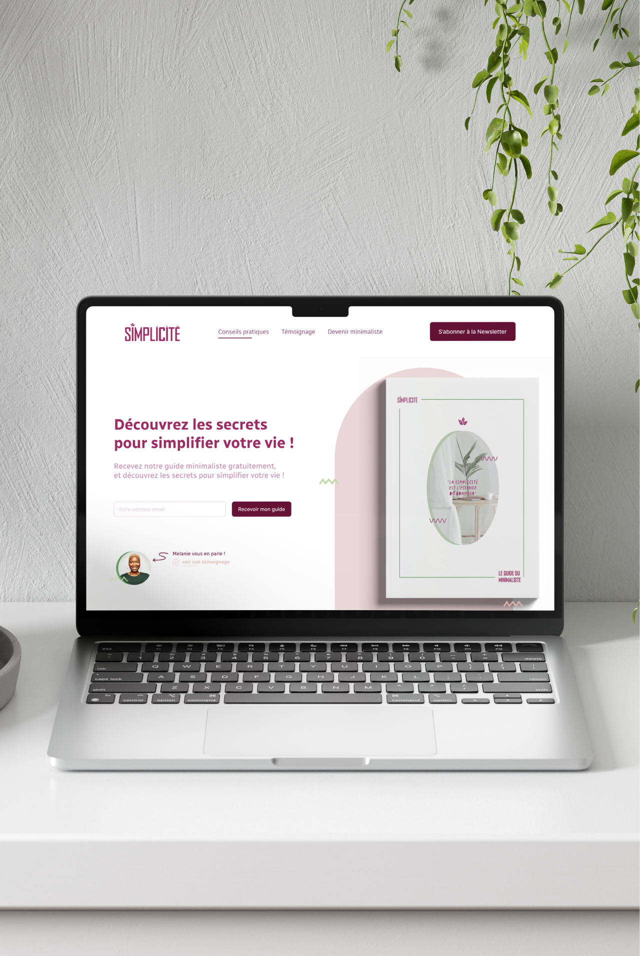 Un projet créatif imaginé à partir d’un brief généré par IA : identité visuelle, logo, one page et maquette de couverture pour un guide sur le minimalisme.